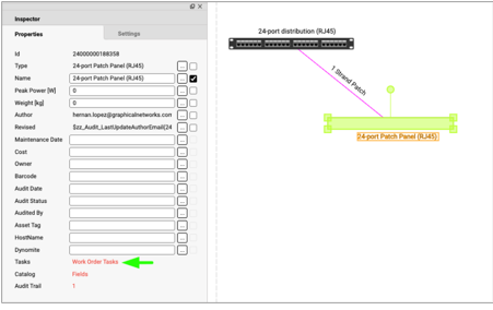 When a work order is generated for an object, it can be accessed by selecting the object. In the Properties window, a direct link to ‘Work Order Task’ is displayed, allowing you to view and manage the associated work order.